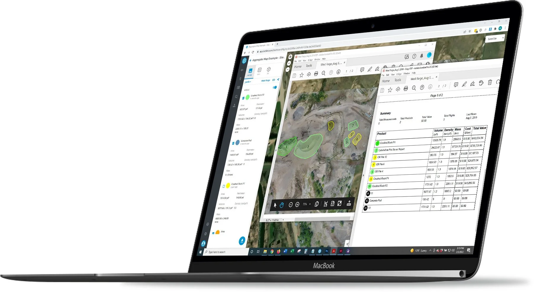 Export site and product data in easy to share PDF reports. Display site map with drone image data overlay. Display measurement shapes on map with associated data table. Color code products for quick data interpretation.